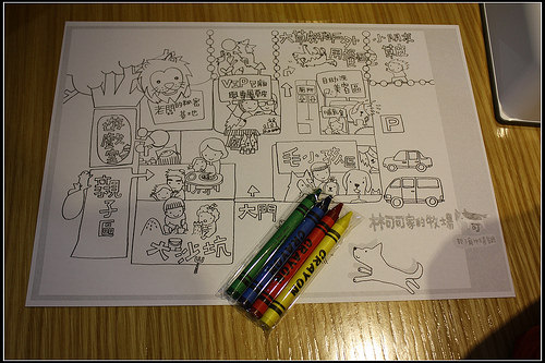 小朋友一入席,就可以先用他們提供的蠟筆以及著色圖來做點靜態活動等待點餐。