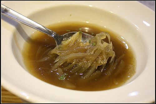 燉煮湯品:洋蔥湯,用牛大骨加上洋蔥下去熬煮,非常濃郁。