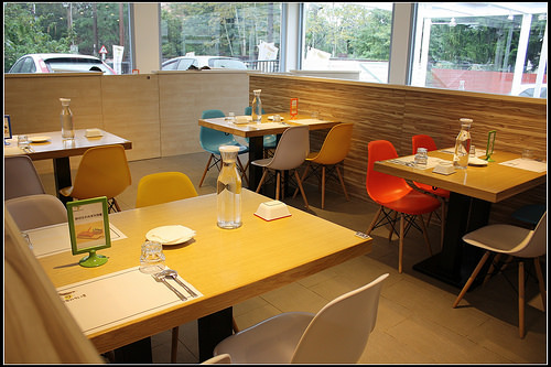 桌椅之間的間距都很大,用的是木質桌子加上色彩繽紛的椅子,很明亮活潑。