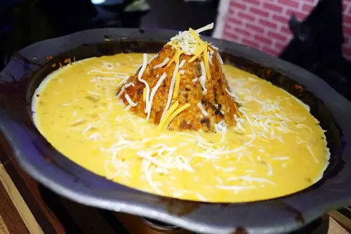 雞與起士的邂逅這道料理,需要瓦斯爐上桌,耐心等待起士漫舞,雞肉本身有用辣醬先煮過唷