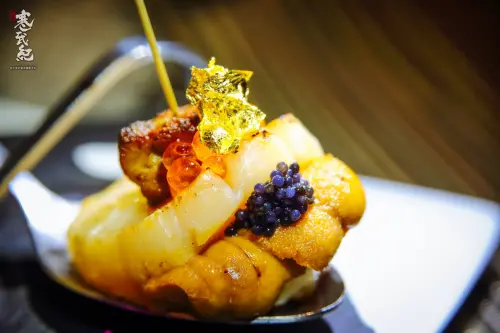 海膽干貝燒佐魚子醬(一顆280元):超大的北海道生食干貝,搭配頂級的日本海膽,一大口吃進去會有冰涼的感覺,慢慢咀嚼後,三種不同層次的口感會在口中層層化開,三種食材沒有添加太多複雜的調味,只有自身的原味,冷的海膽、熱的干貝雙重溫感,極致奢華的小品料理!