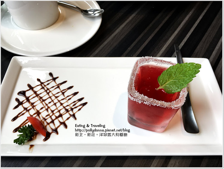 友人點的葡萄酒凍,覺得看起來很特別,杯緣白白的地方我原本還以為是結冰的霜,但其實是糖,搭配酒凍一起享用。