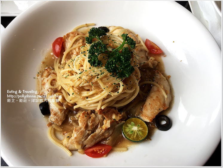 主餐我點的是清炒蒜味雞胸義大利麵。這盤麵我也蠻喜歡,因為是清炒,沒有其他醬汁的味道,可以吃到單純的橄欖油和蒜清炒的香氣,把附上的金桔擠一點上去,又帶點微酸的味道,雞肉稍微煎過,口感軟嫩適中,而且麵的份量還蠻夠的。(NT.178)
