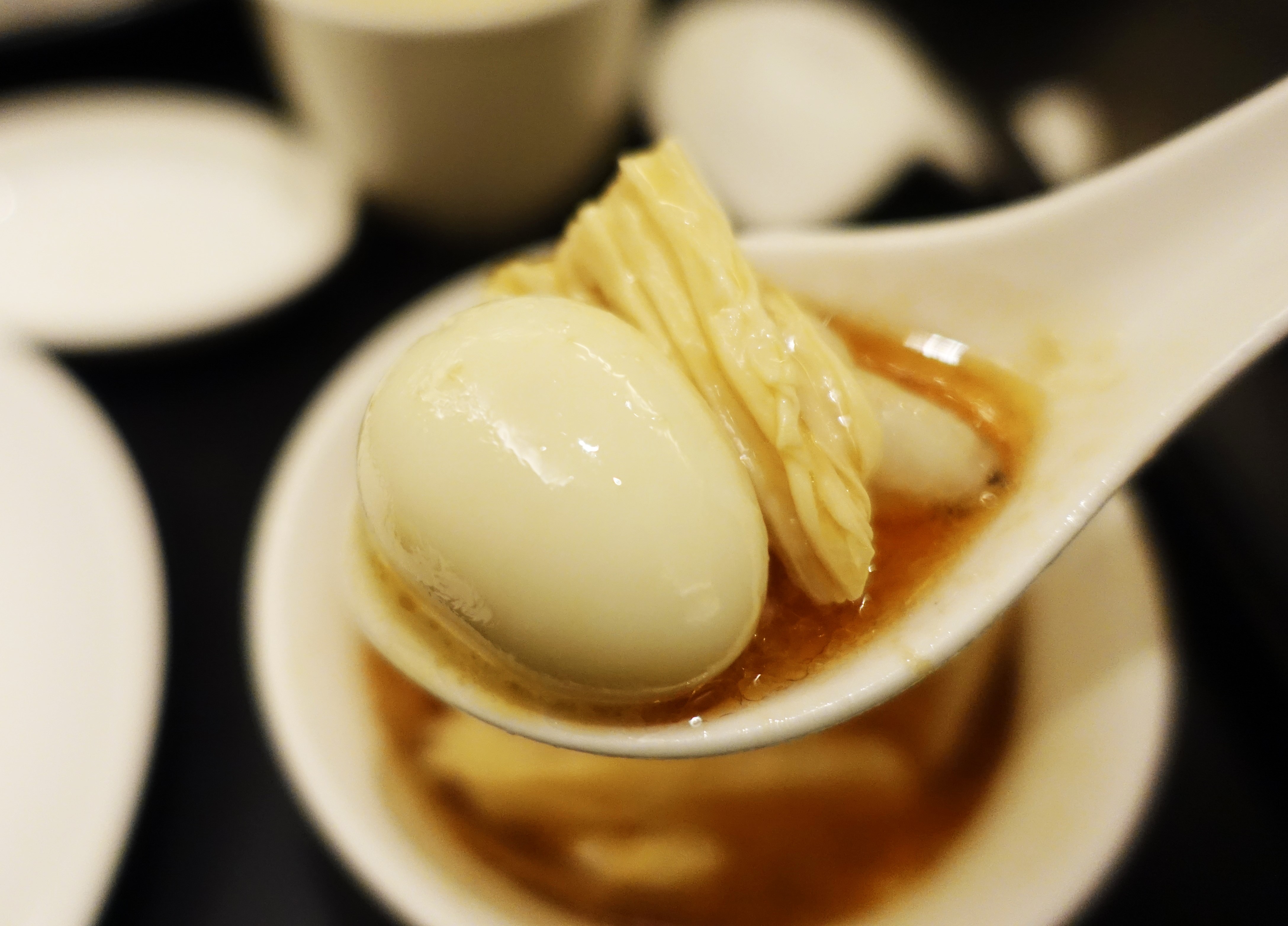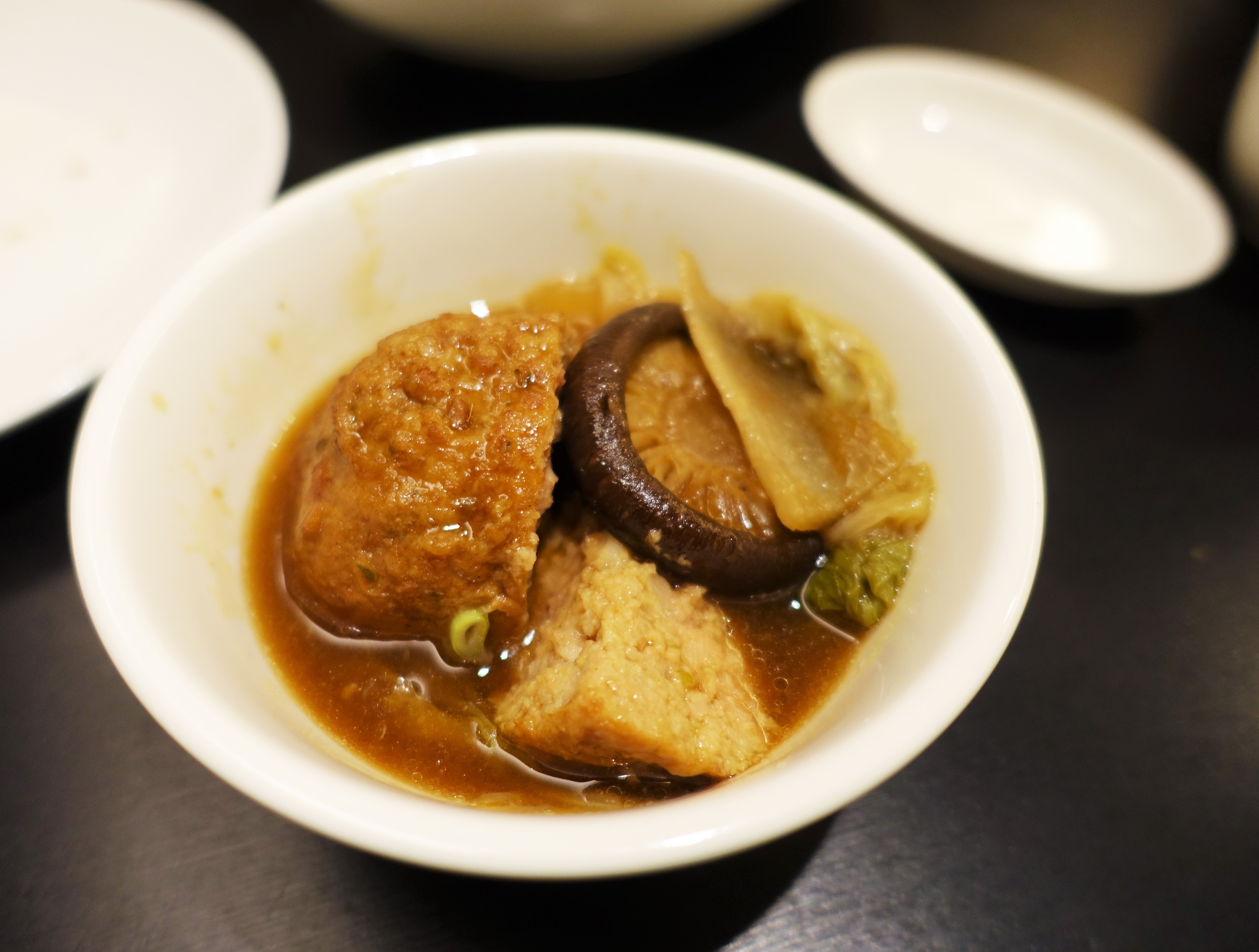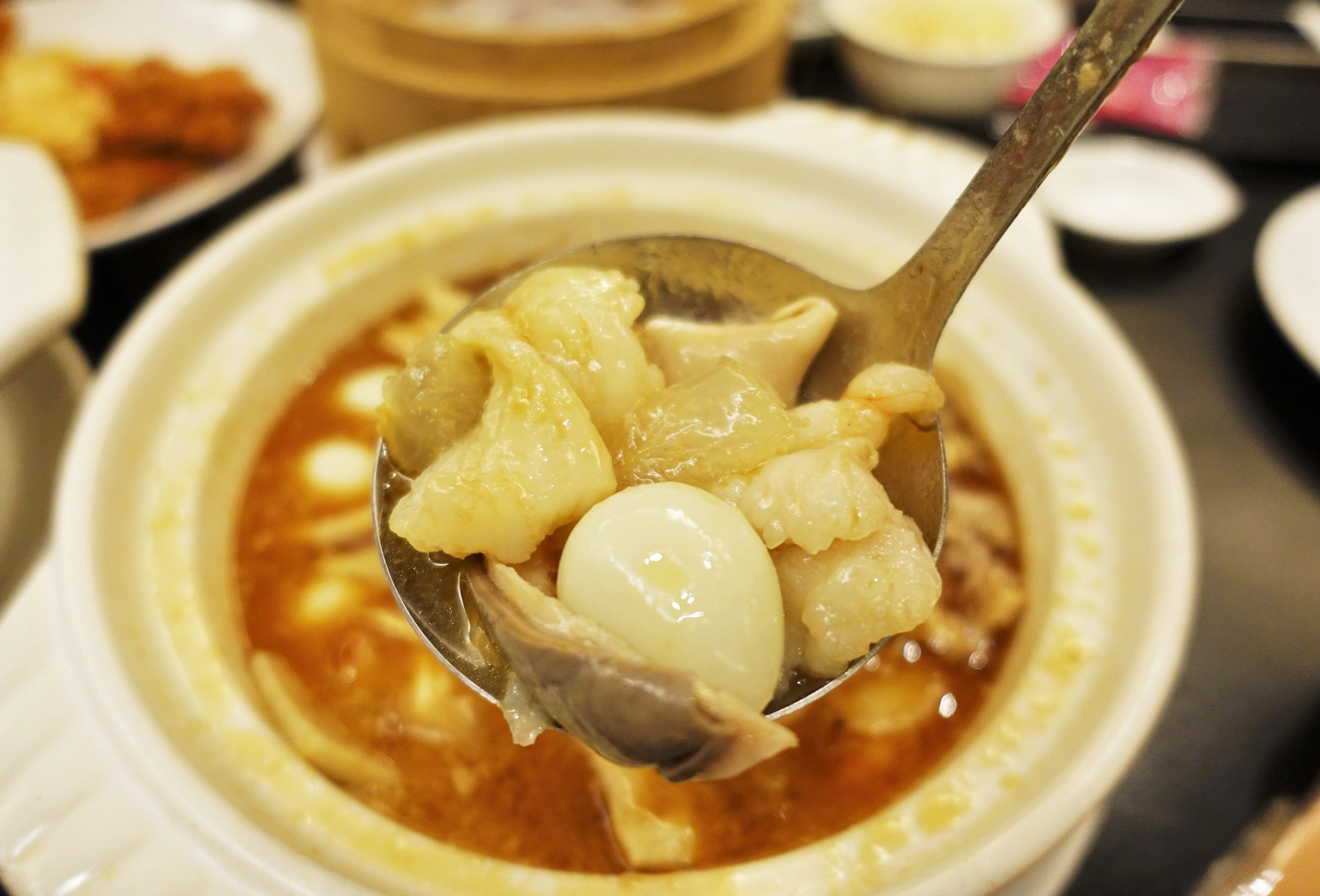 隨手一舀滿滿的配料中可見:魚肉、豬肚、鳥蛋、杏鮑菇、蟹肉、豬的後腳筋等豐富食材,不用多說,肯定是相當令人滿足的口感與滋味!