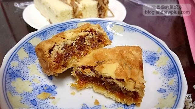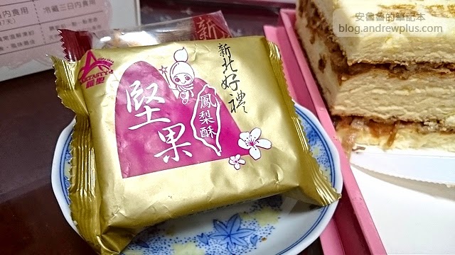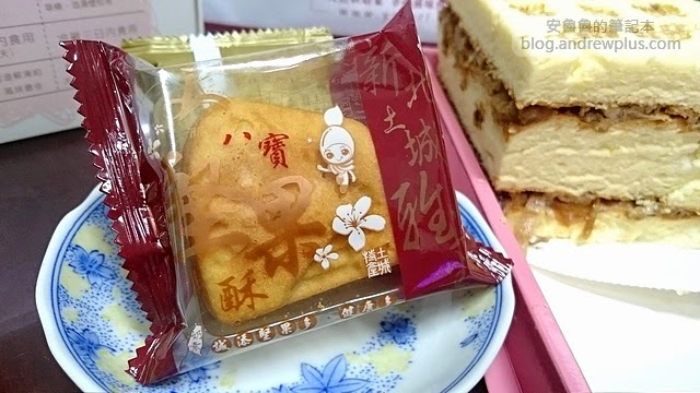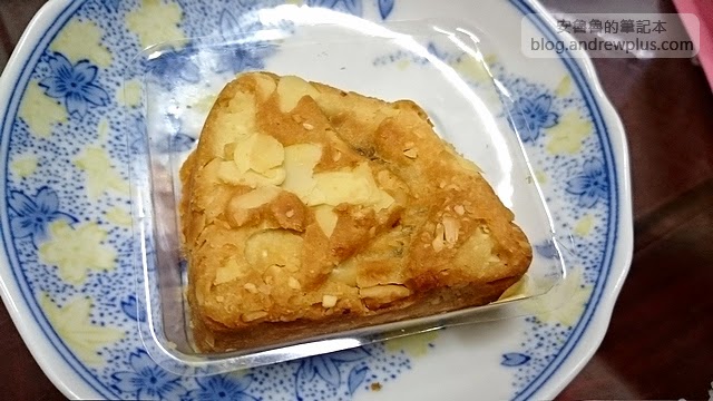 土城餅的部分有兩種分別是鳳梨酥和堅果酥,鳳梨酥的外皮有裹上杏仁片,小安子好像還沒有吃過外皮裹著杏仁片的鳳梨酥,咬一口之後就馬上知道,內餡是用土鳳梨做的,有著土鳳梨特有的酸味,略帶一點點的甜味,吃起來不會甜膩,整體來說也不會油滋滋的,來一杯熱茶嘟嘟好!!