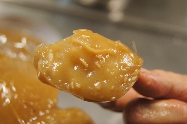 我們現在看到的米粹是糯米經過3~4小時浸泡、研磨成米漿、擠壓出多餘水份(約2個小時),直到米漿完全脫水成米粹(也稱為粿粹)。