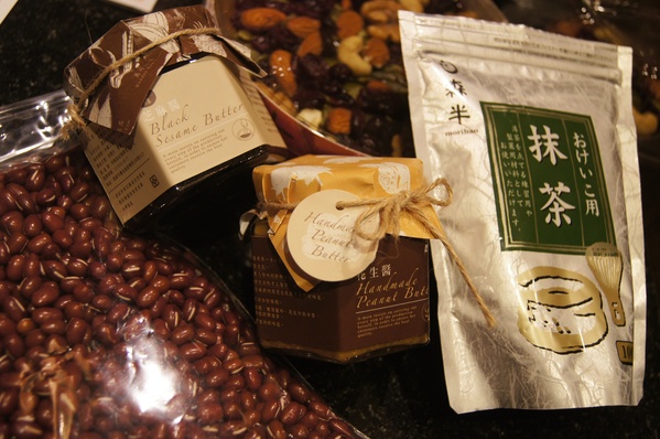 以上是阿綿麻糬內餡料來源,有萬丹紅豆、大甲芋頭、森半抹茶粉,而花生醬與芝麻醬則是阿綿手工製作的,以玻璃包裝,可以買回去夾土司喔。