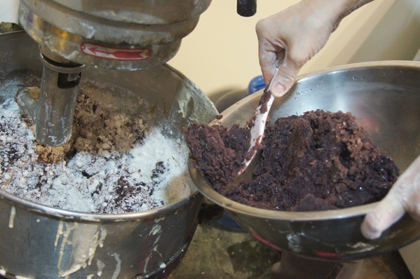 而紅豆..因為機器會把紅豆打成泥,為呈現顆粒口感,攪拌機裡只能預先攪拌一半的紅豆,另一半紅豆則需以手工攪拌。