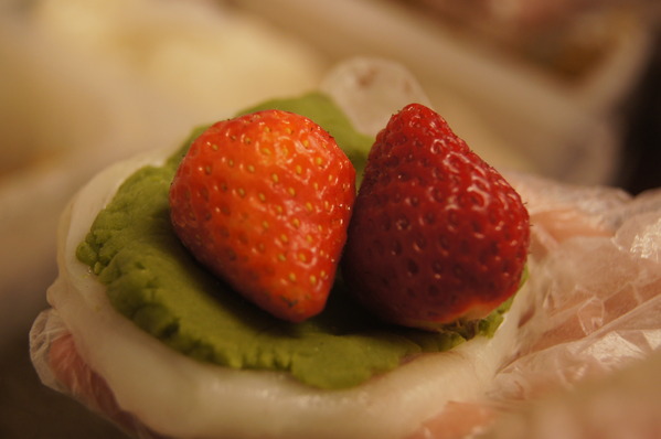 除了麻糬,還有水果大福,今年因為霸王級寒流來襲,草莓品種略小,因此阿綿放了2顆草莓入餡。