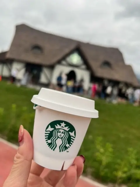 一整個很大的園區廣場,四周牆面有鐵路彩繪
