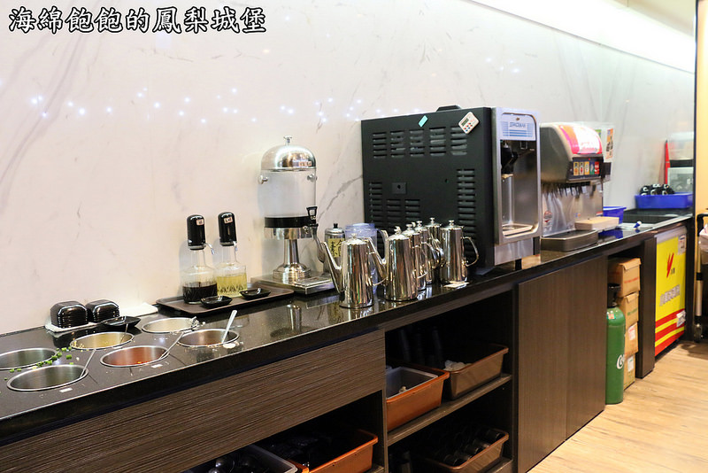 內用自助區,有佐料、湯頭、飲料、霜淇淋與冰淇淋