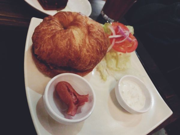 這道餐點,除了可頌香嫩雞之外,一旁也還有生菜以及小香腸與塔塔醬