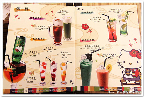 MENU很特別木頭封面挖空露出Hello Kitty,翻開第一頁就是頭上戴著山茶花穿和服的凱蒂貓