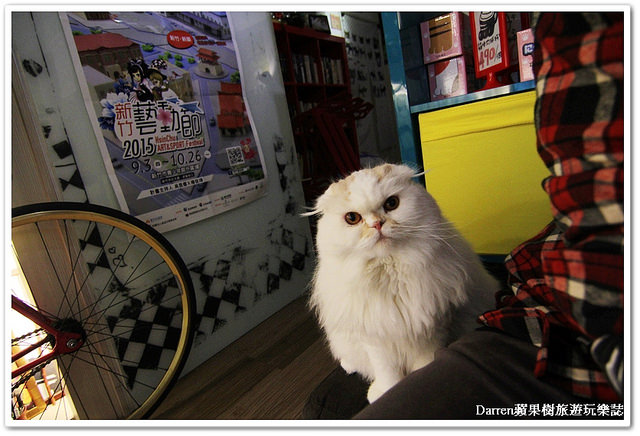 拍照拍到一半就在這個藍色櫃台前的沙發坐了一下,這時候突然有白色生物出現在我腿邊
