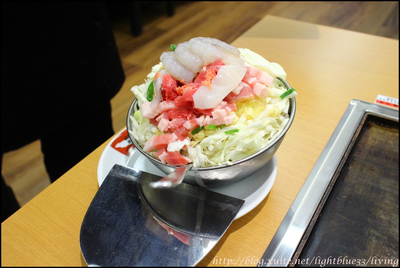 我們點的風月大阪燒很快就會將食材上桌,可以看到豬肉、牛肉、蝦子、花枝,還有蛋跟高麗菜絲