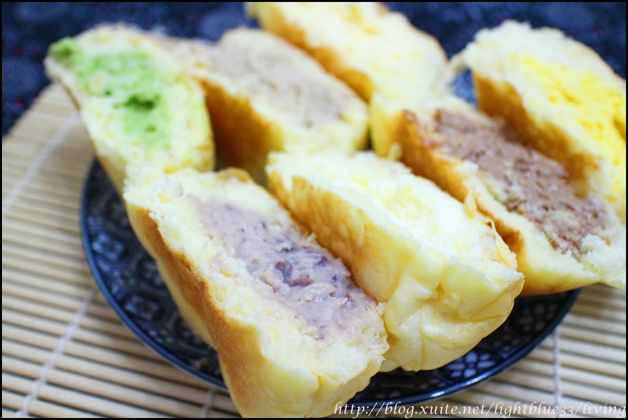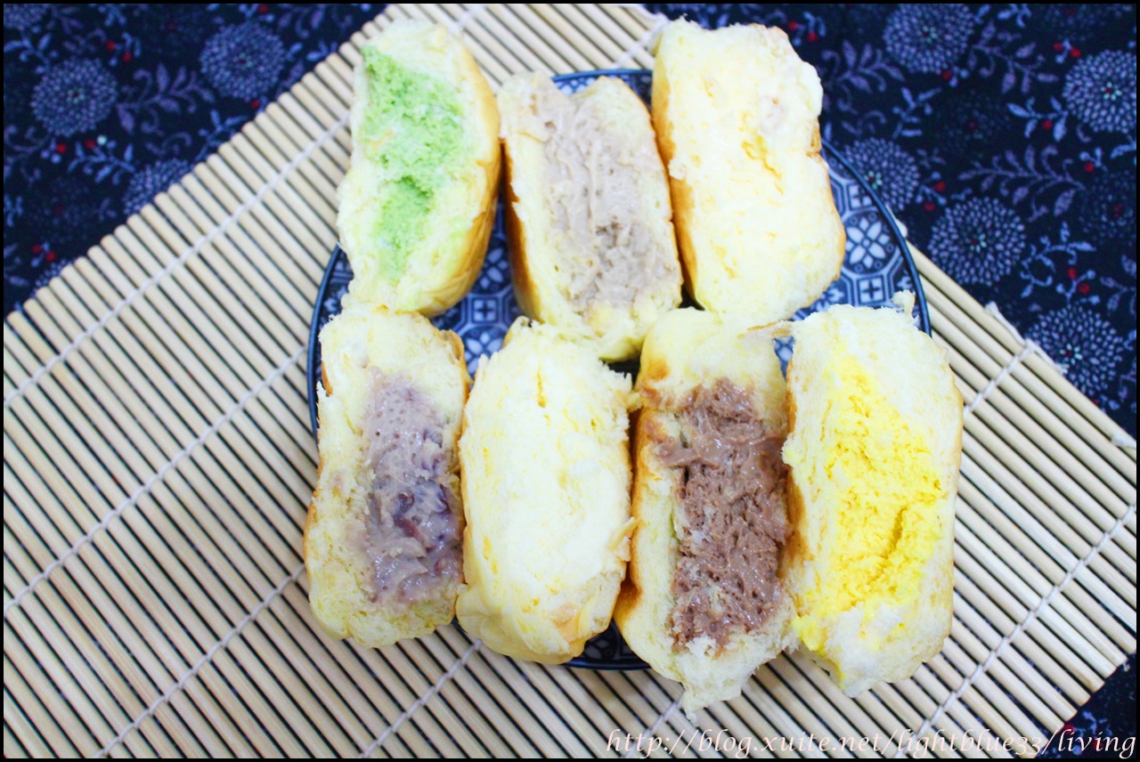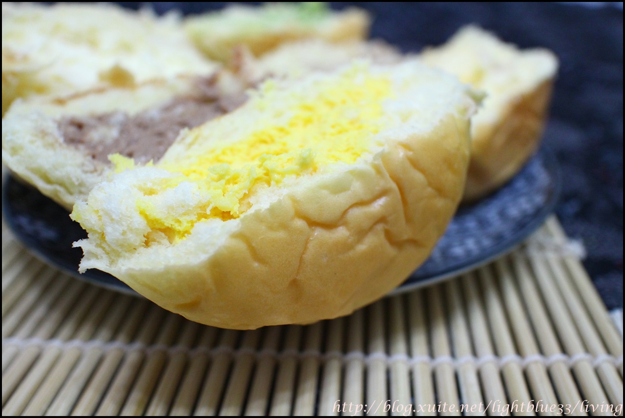 再來看到他們的內餡,每一個都裝填得很飽滿,跟麵包之間不會有縫隙,也因此會吃來很有飽足感,不過要切開的時候倒是比較不容易,但若不是為了照相,直接用嘴巴整個大口咬下會比較簡單