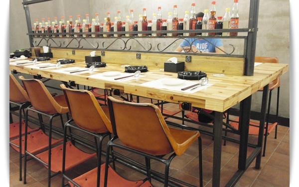餐具整齊地擺放著,位子架上都是滿滿的醬油.醋調味料等~~