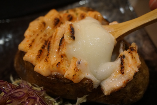 馬鈴薯上鋪著滿滿的明太子奶油醬後,用火去烤出焦色,光看就流口水。