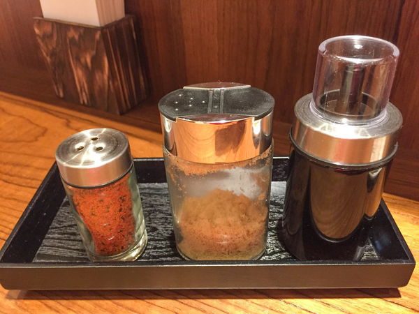 桌上的調味料除了味噌醬汁跟七味粉之外,另外還有特別的花生粉