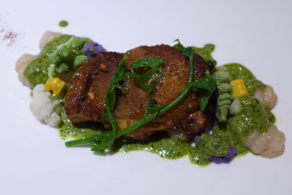 大塊的雞腿排豪氣地放小巧的麵疙瘩上,一旁還有五顏六色的蔬菜陪襯,
