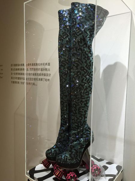 ▲這只過膝溜冰長靴, 上頭佈滿凱斯哈林經典圖案以及施華洛斯奇水晶 , 閃閃發亮的溜冰靴出自一位受到凱斯哈林啟發的倫敦高級時裝設計師之手的重點作品,此位設計師也演繹了哈林的重要思想,包含「安全性行為」。