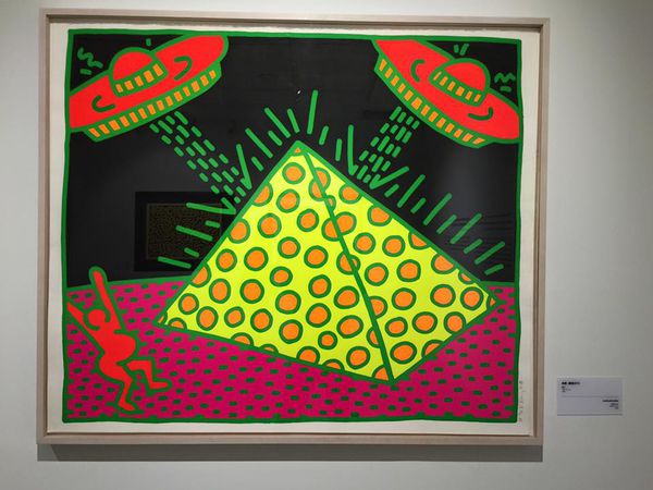 ▲《豐饒》系列作品中, 哈林將他的地表圖像化作人生疾病的象徵 。 有別於過去具有閃耀奪目色彩的作品 ,此系列透過不安的懷孕婦女圖像,表達緊張的氣氛。 哈林透過普遍性的視野來表達生存的具體焦慮感。 掙扎與焦躁不安的情緒透過嬰兒 、 懷孕婦女 、 金字塔及幽浮等圖案呈現於作品中。