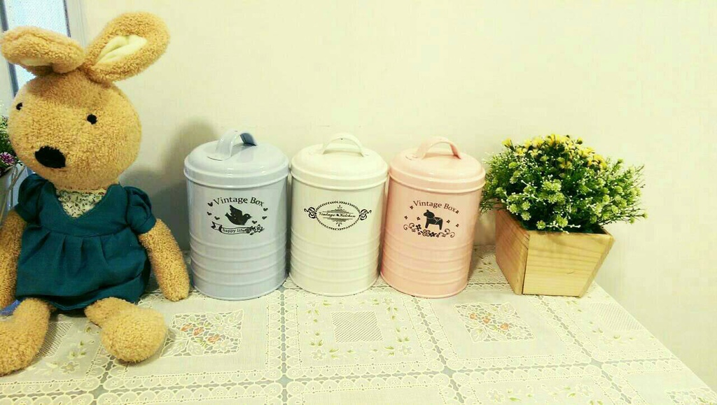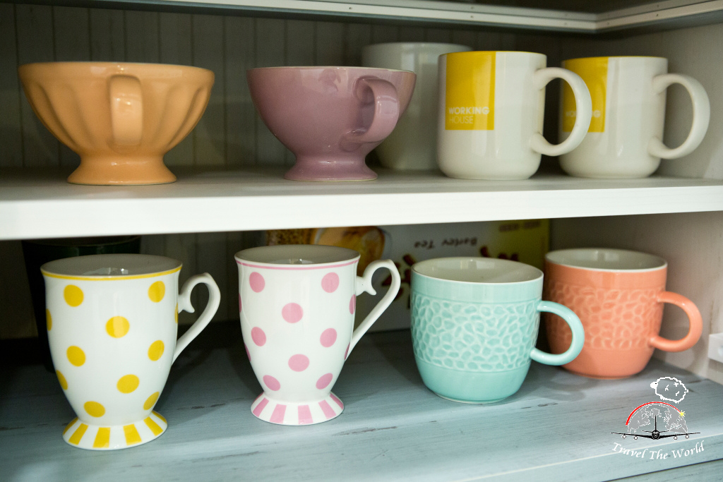 在走廊上的粉藍色櫃子內,放置許多可愛的杯子,