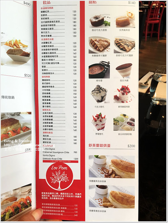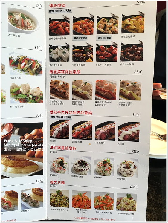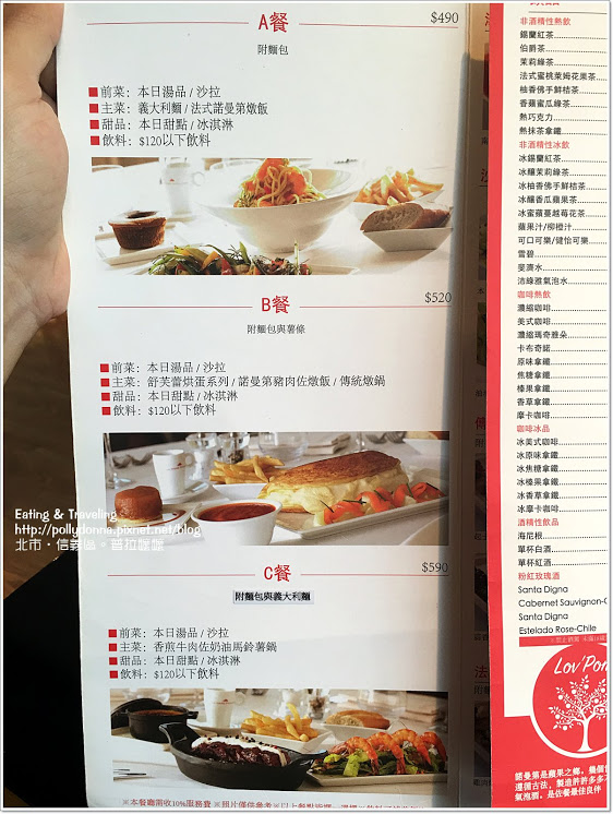 A餐主餐是義大利麵或法式諾曼第燉飯,附麵包;B餐主餐是烘蛋系列、諾曼第豬肉佐燉飯和傳統燉鍋的選擇,附麵包和薯條;C餐主餐則是香煎牛肉佐奶油馬鈴薯燒。價格分別是NT.490、NT.520、NT.590(皆須收取10%服務費),除此之外,套餐都有附前菜、甜品和飲料。