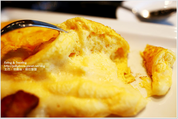 把舒芙蕾切開,蛋皮裡面充滿了蓬鬆的蛋汁泡泡,這種泡泡口感就是舒芙蕾特別之處,但我想這樣的口感不是每個人都能接受,因為比較沒有吃到食物的那種實際口感,就是泡泡這樣,但這蛋汁泡泡才是精華處,要靠很純熟的技術才有辦法做出這樣的料理,拿來搭配馬鈴薯和培根一起享用是還ok,雖然我沒有特別喜好這樣的味道,不過舒芙蕾算是蠻特別的餐點。