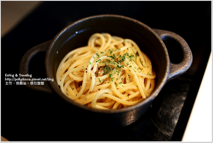 燉鍋附的義大利麵,是完全無味的義大利麵,因為算是附餐,份量很小,這種鑄鐵鍋就是那種最小的,在咖啡廳會拿來裝簡餐的主餐或是甜點那種。