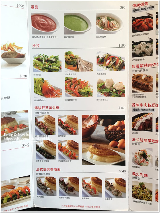 餐點有湯、沙拉、舒芙蕾烘蛋、舒芙蕾燉飯、燉鍋、諾曼第豬肉佐燉飯、香煎牛肉佐奶油馬鈴薯燒、法式諾曼第燉飯、義大利麵等。