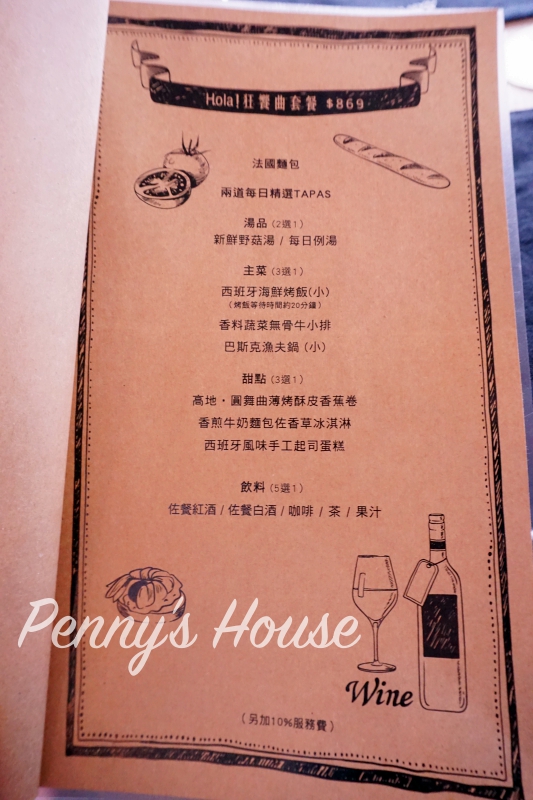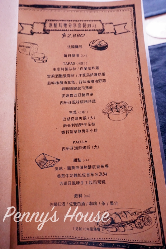 內容包含四道Tapas、一道湯、二道主菜、二道甜點,共九道料理。