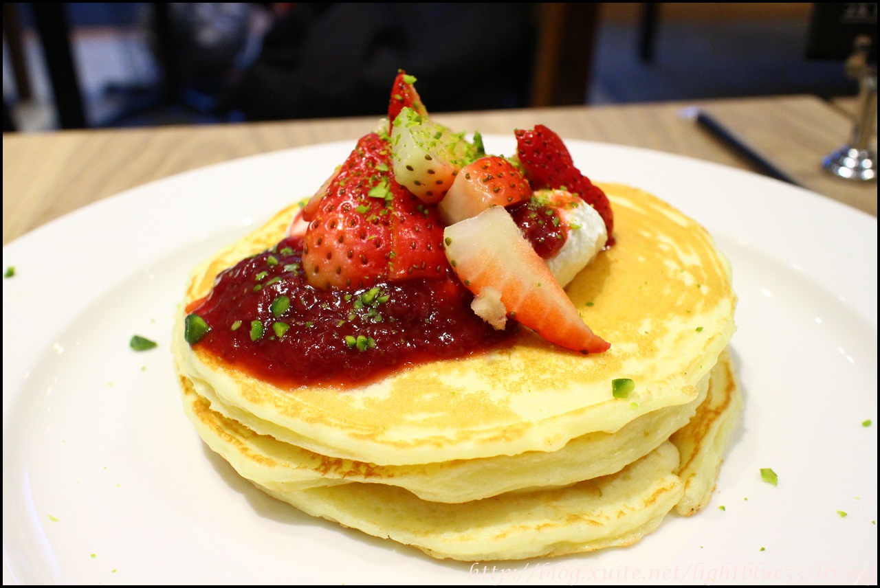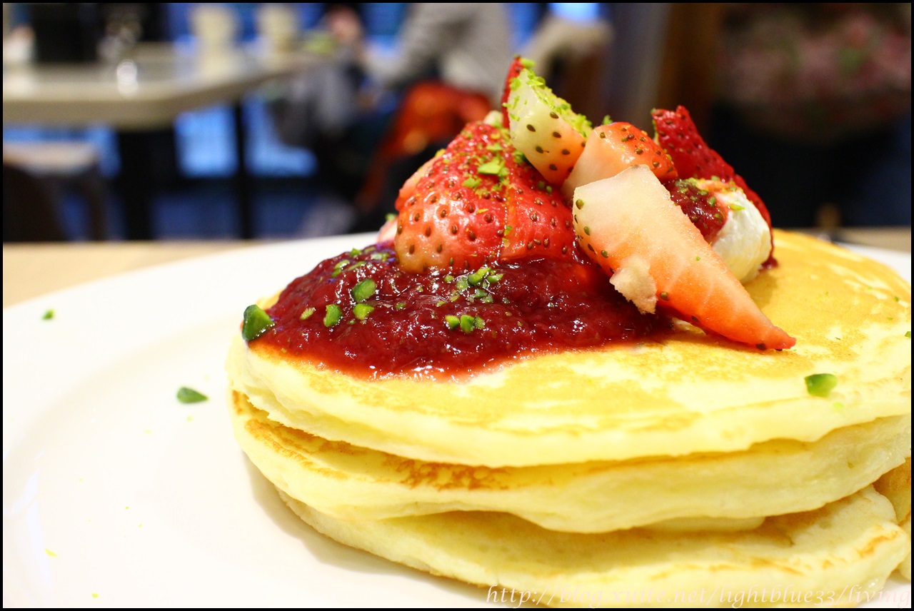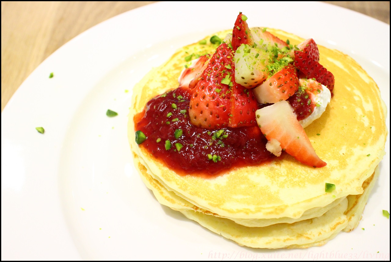 鬆餅有不規則的手作感,堆疊三層,再淋上色彩飽滿的草莓醬跟新鮮草莓