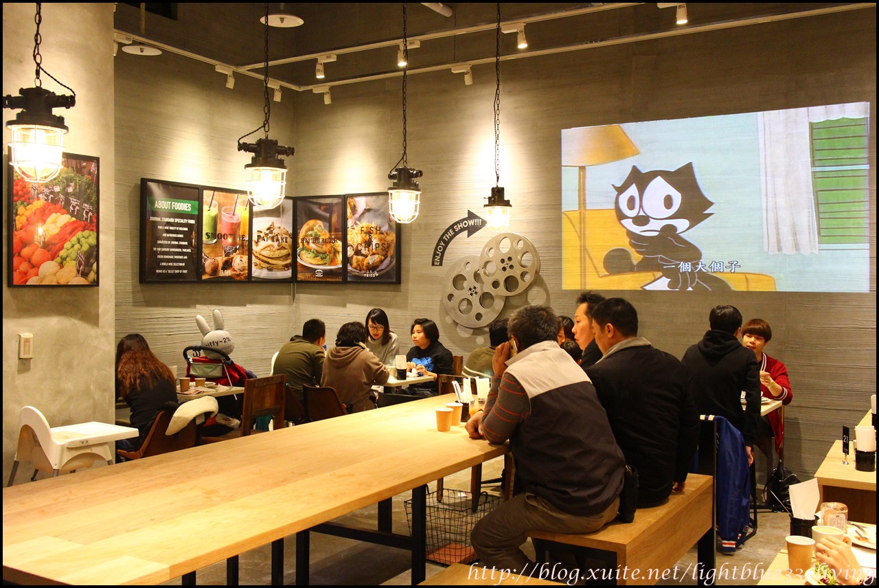 後方座位區比較有點工業風,牆面上還有投影卡通
