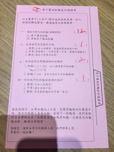 得填這張粉紅色的單子,照慣例湯的濃度跟麵的粗細皆可調,也提供免費加麵服務。