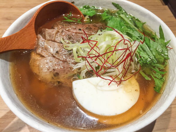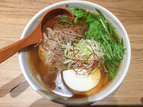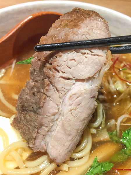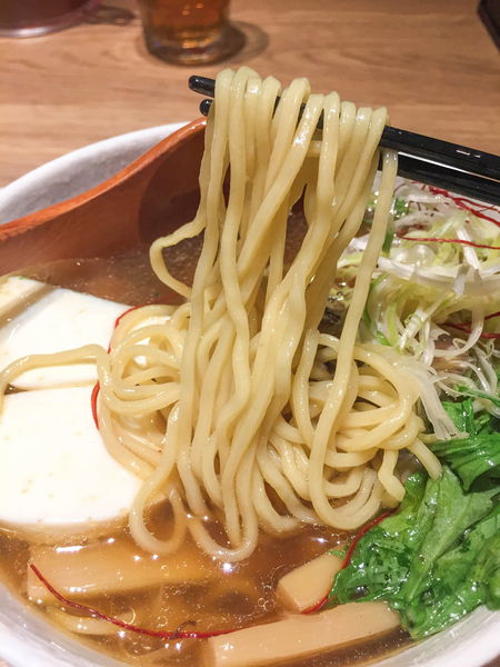 比較特別的是香菜跟兩片蛋白。魚介湯頭充滿海鮮香氣,鹹度雖高但帶點回甘的甜,吃慣日式口味的人