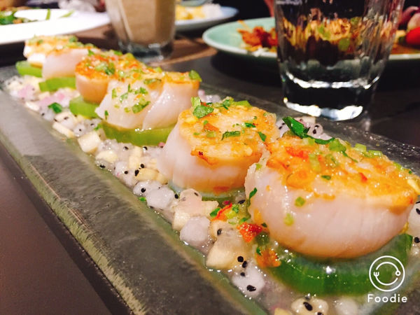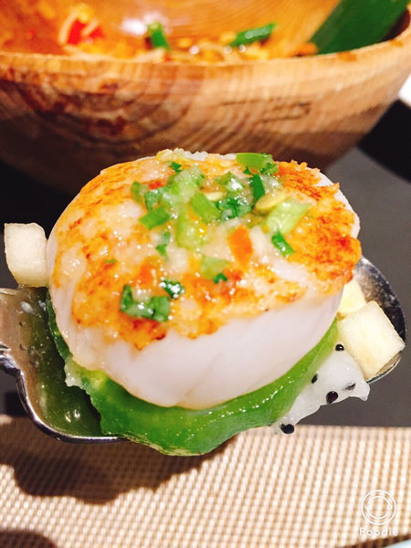 干貝大顆飽滿,下頭配上奇異果滋味酸甜很特別的搭配方式!充斥著果香!!雖然名為煎干貝但她其實是生的干貝只是上頭稍微煎過,基本上是生的干貝!