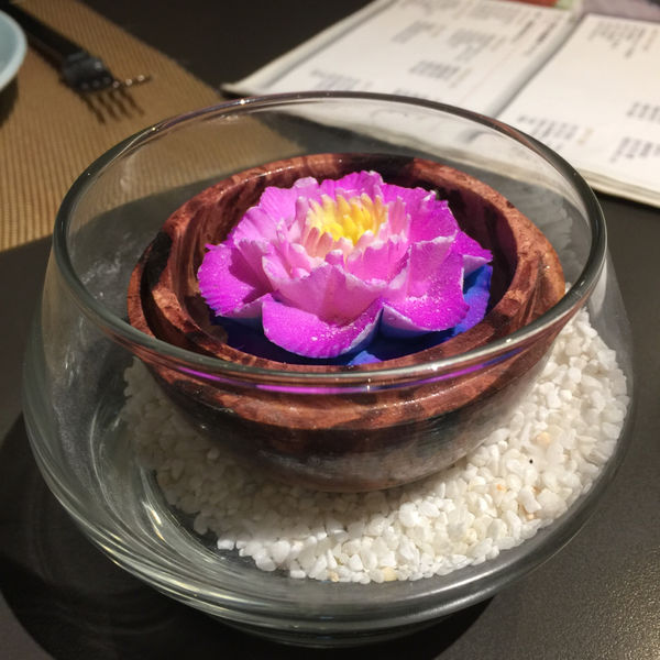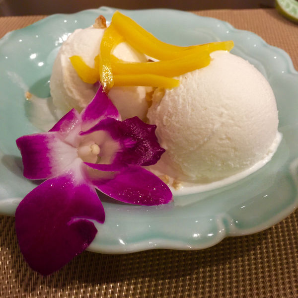 甜點也裝飾的很美,上面的是真花不是塑膠花喔!還聞的到花香味呢!椰子冰吃起來很濃稠綿密,椰子味也很濃厚!真的是很純的椰子味啊喔