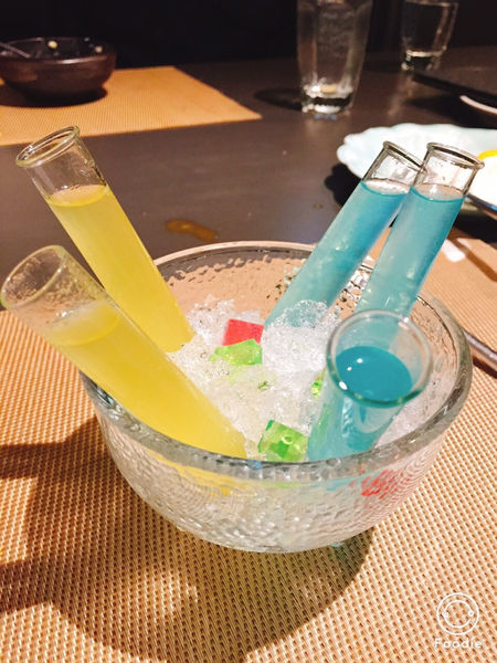 最後招待的試管飲品!藍色的是檸檬口味,黃色的是鳳梨,比較像調味的飲料! 我比較愛喝現打果汁拉!
