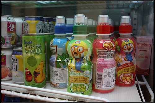 除了韓國類的燒酒之外,還有從韓國進口的碳酸飲料、草莓、香蕉牛奶等!我馬上看到之前去韓國愛寶樂園的卡通人物Pororo!!!