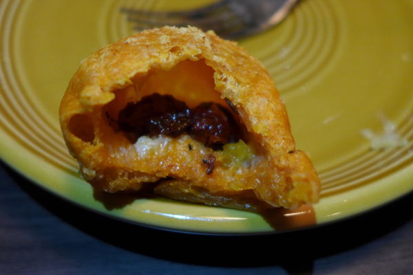 戳開後Pizza 球後,肉質真的蠻嫩的紅咖哩雞肉就暗藏在其中,