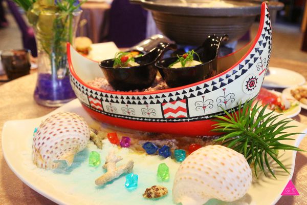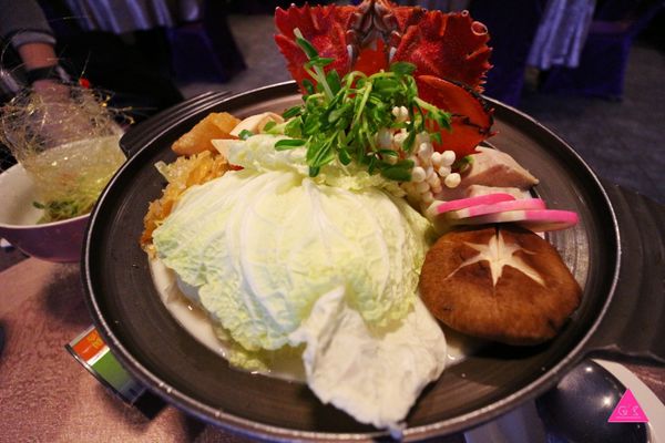 以牛奶為湯底加上旭蟹、貝類各種菇類與蔬菜熬煮出來的海鮮鍋