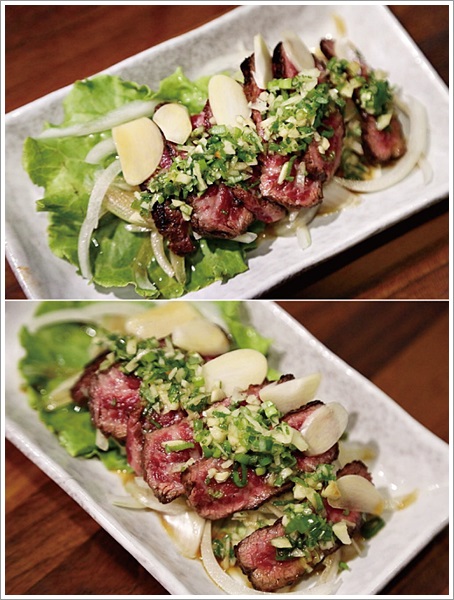 | 生牛舌根我不敢吃,但這道炙燒牛小排刺身(320元)我就愛炸了… 而且牛小排加著蒜頭和洋蔥一起吃完全就是一絕… 真的是愛死這盤了… |