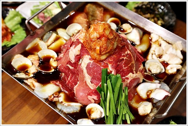 | 端上桌後大家快門還是猛拍不停… 這平盆鍋真是不管任何角度拍都好美… 完全就是讓人不忍心摧毀它… 我們點的平盆鍋是兩種口味合成一鍋所以更是壯觀… 而服務人員在送上來時還特別說明了平盆鍋的由來… 這平盆鍋一開始是幾個在日本工作的韓國人因想念家鄉的起士海鮮辣鍋所發想出來的… 一方面結合了日本壽喜燒,再加上大量的水果和蔬菜來熬煮… 因此就造究了平盆鍋的由來… |