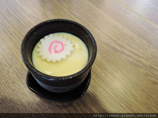 7小孩專屬的茶碗蒸,光滑、紮實的蒸蛋表面有魚板,內容有蛤蜊、豬肉等,