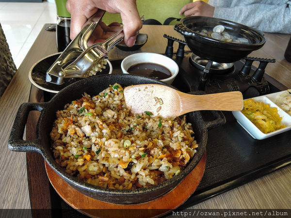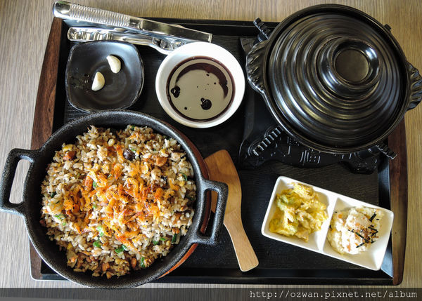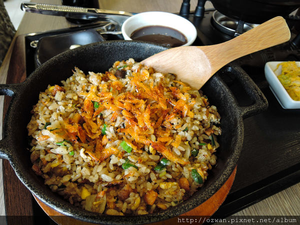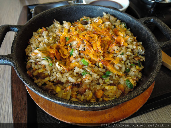 主食是鐵鍋櫻花蝦鮭魚炒飯,