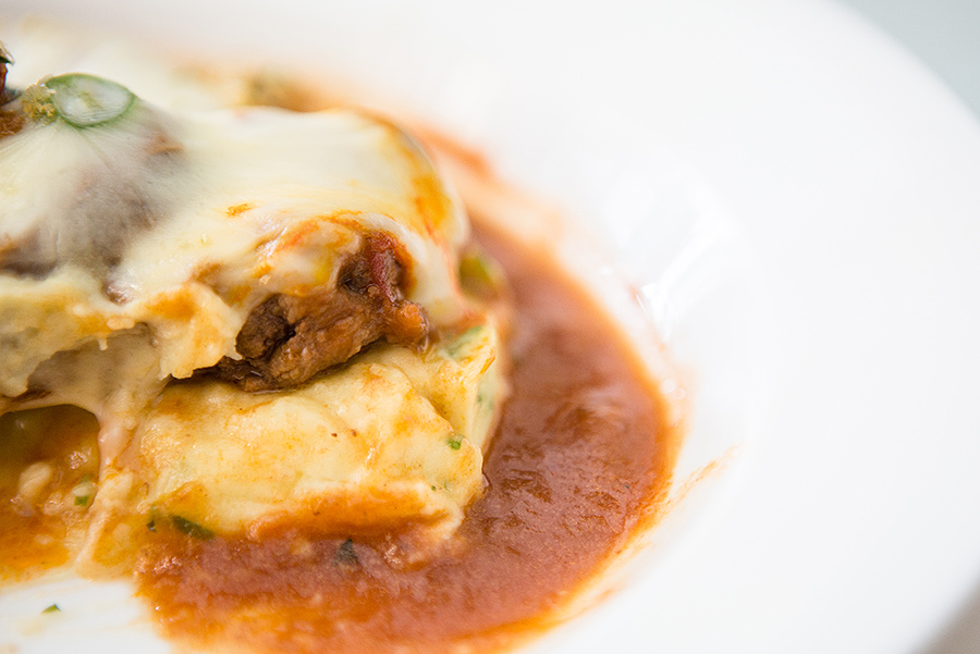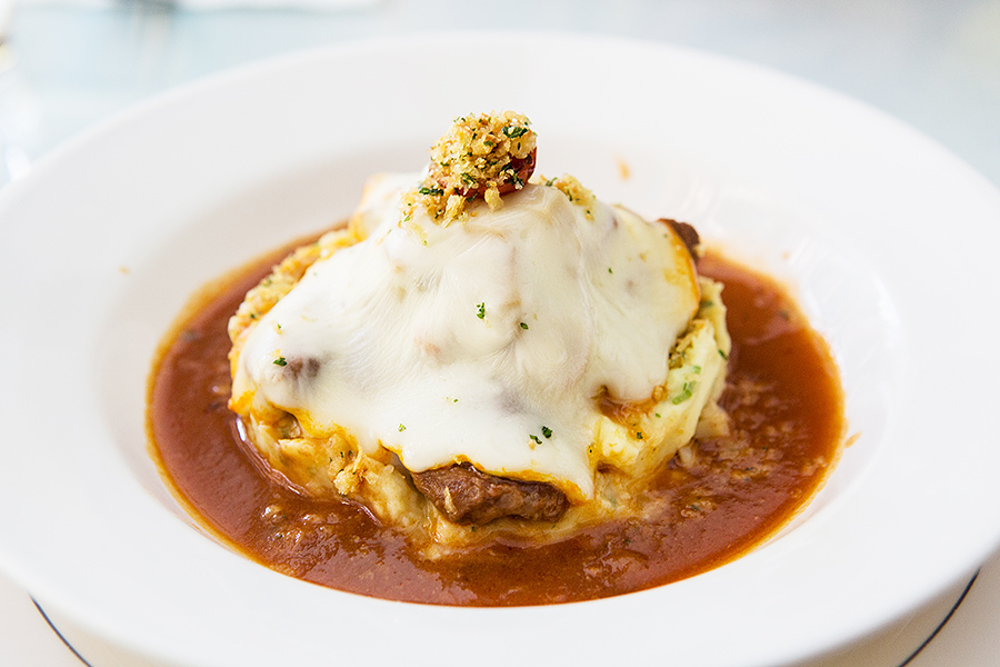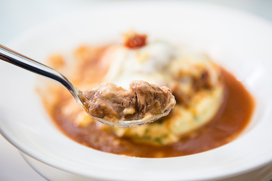 在馬鈴薯泥上放上燉至軟嫩入味的的燉牛肉在覆上一層起士焗烤