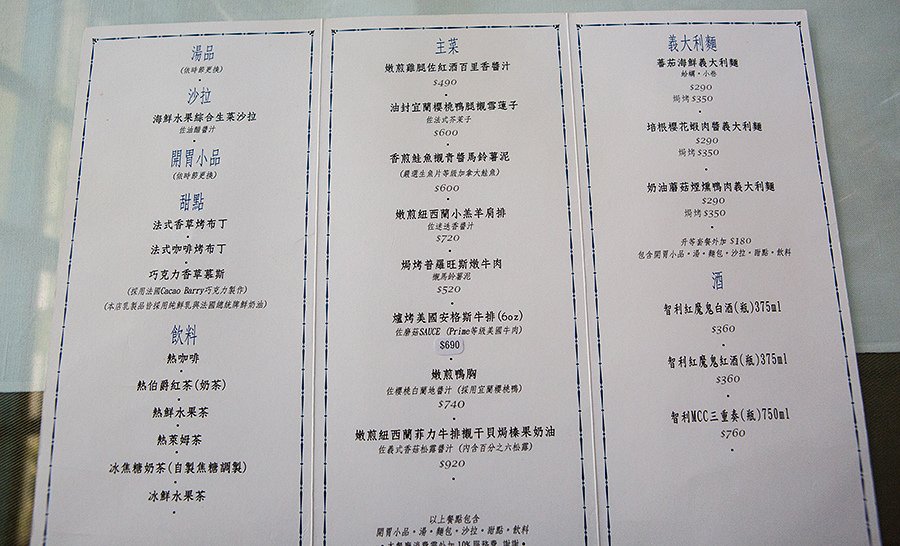 店內的餐點主要以義大利麵及排餐為主,排餐會含開胃小菜、湯品、麵包、沙拉、甜點以及飲料