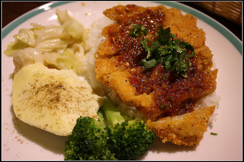老爺點的黑胡椒豬排飯(NT100),豬排炸得也還不錯,淋上黑胡椒醬,我覺得辣味比椒麻雞更甚!