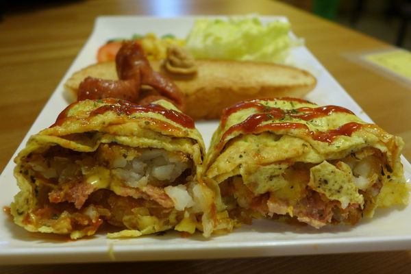光看到淋上豐富番茄醬的蛋皮裹著不折不扣的兩片薯餅,